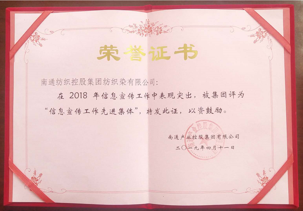 4月12日下午,產控集團召開了產控系統(tǒng)辦公室主任工作會議,會上對2018年度通訊宣傳工作,進行了表彰,南通紡織控股集團紡織染有限公司榮獲2018年度產控集團“信息宣傳工作先進單位”榮譽稱號。