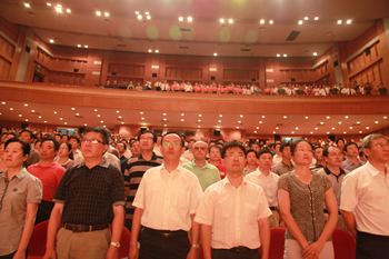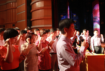 五年新跨越 歌聲獻給黨 ----集團隆重舉行“七一”總結(jié)表彰大會暨文藝匯演活動 6月30日下午,產(chǎn)控集團召開“七一”紀(jì)念表彰大會暨大型文藝匯演活動。集團所屬20家黨組織、近千名黨員參加活動,回顧黨的光輝歷程和“十一五”發(fā)展成果,以昂揚的歌聲表達對黨的熱愛。市國資委李桂順主任、市委組織部宋建宏處長應(yīng)邀出席,集團黨委副書記徐憲華主持大會。 大會表彰了2010年度“五好”黨組織、優(yōu)秀黨員和優(yōu)秀黨務(wù)工作者,以及在“創(chuàng)先爭優(yōu),實現(xiàn)跨越發(fā)展”暨慶祝建黨90周年系列活動中涌現(xiàn)的先進集體和個人。全系統(tǒng)20多名新黨員面向黨旗進行入黨宣誓,與會黨員重溫了誓詞。 集團黨委書記、董事長陳照東代表黨委作報告。他指出,全市經(jīng)濟社會發(fā)展已進入“兩個率先”的關(guān)鍵時期,產(chǎn)業(yè)現(xiàn)代化是市委確定的三大目標(biāo)之一,產(chǎn)控集團要成為產(chǎn)業(yè)現(xiàn)代化的生力軍。他要求,圍繞“十二五”期末實現(xiàn)總資產(chǎn)、銷售額“雙兩百億”的目標(biāo),各級黨組織要引領(lǐng)科學(xué)發(fā)展,統(tǒng)籌謀劃發(fā)展思路、發(fā)展戰(zhàn)略,重點加 快洋口港新城、觀音山新城和生物科技園的新興產(chǎn)業(yè)建設(shè)和傳統(tǒng)產(chǎn)業(yè)的優(yōu)化升級;全體黨員要爭做先鋒模范,以企為家,立足崗位,創(chuàng)新、敬業(yè)、奉獻;通過建設(shè)學(xué)習(xí)型黨組織,加強人才引進和培養(yǎng),積極推進民主管理,加強反腐倡廉建設(shè),以創(chuàng)先爭優(yōu)為主題創(chuàng)新黨建工作內(nèi)涵,圍繞深化改革、加快發(fā)展、維護穩(wěn)定的大局提供 堅強的政治和組織保障,為集團實現(xiàn)新的跨越保駕護航。 大會在雄壯的《國際歌》歌聲中結(jié)束。會后,以“黨旗輝映產(chǎn)控情”為主題的大型文藝匯演隆重上演,產(chǎn)控系統(tǒng)十家單位選送了精彩的歌舞、小品、詩朗誦等節(jié)目,贏得陣陣喝彩,向社會展現(xiàn)了產(chǎn)控人“齊心向黨、追求跨越”的嶄新風(fēng)貌。
