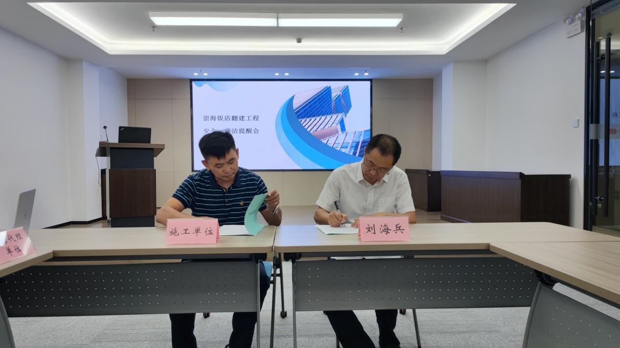 會上,國融公司黨委書記、董事長、總經(jīng)理劉海兵向與會人員介紹崇海飯店翻建項目具體情況。國融公司與相關(guān)合作方簽訂安全責(zé)任書、廉潔責(zé)任書,項目管理人員簽訂廉潔承諾書。