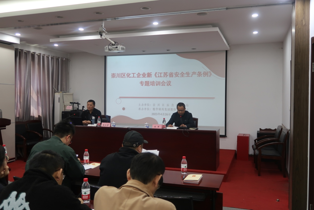 精華制藥制劑生產(chǎn)公司于4月26日下午組織開展新《江蘇省安全生產(chǎn)條例》專題培訓(xùn)會議,此次培訓(xùn)特邀江蘇省安全教育培訓(xùn)專家、高級安全教育培訓(xùn)師朱江濤授課,崇川區(qū)應(yīng)急管理局、崇川區(qū)重點企業(yè)主要負(fù)責(zé)人、安全管理人員、精華制藥生產(chǎn)公司相關(guān)管理人員參加培訓(xùn)。崇川區(qū)應(yīng)急管理局副局長李軍主持會議。